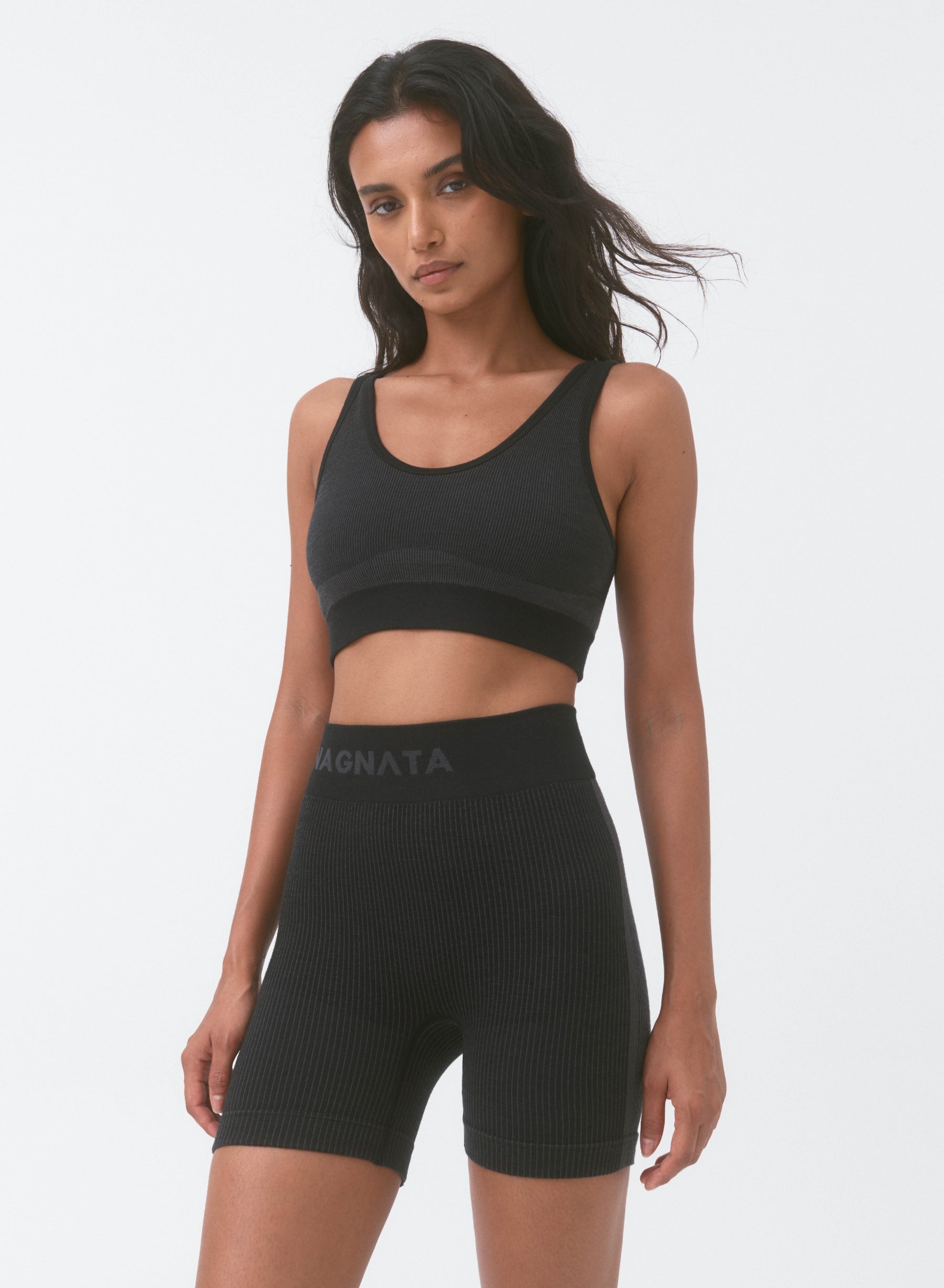 Superfine high-waisted Merino wool seamless knit rib mini short made in Nagnata's signature seamless fabrication offering mild compression for support and breathability. The style features a double layer waistband with jacquard Nagnata logo on front and back waistband. Crafted in Nagnata's signature Nagnata rib, these shorts include contrast jacquard stripe placement artwork.